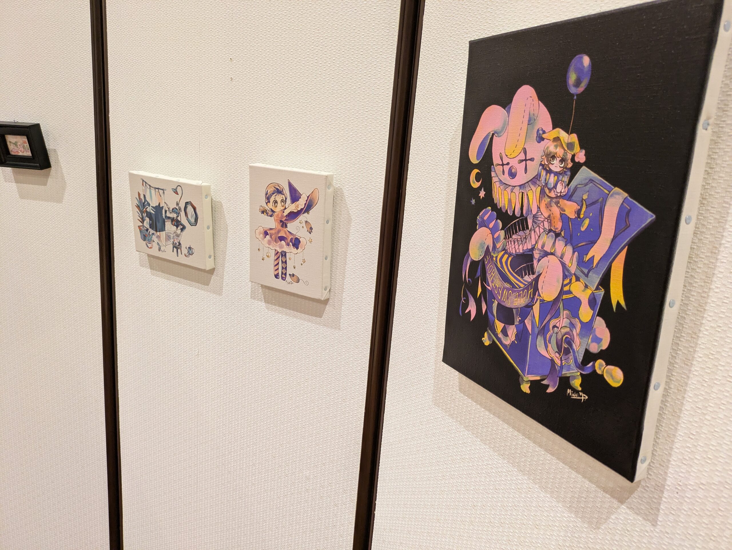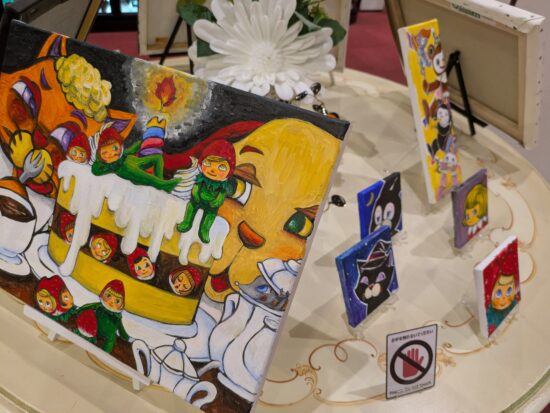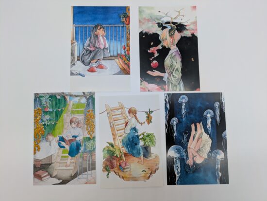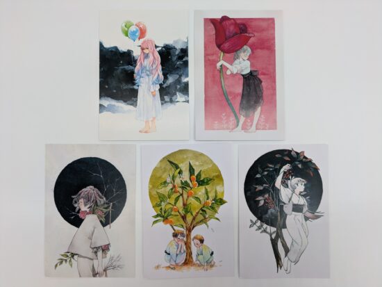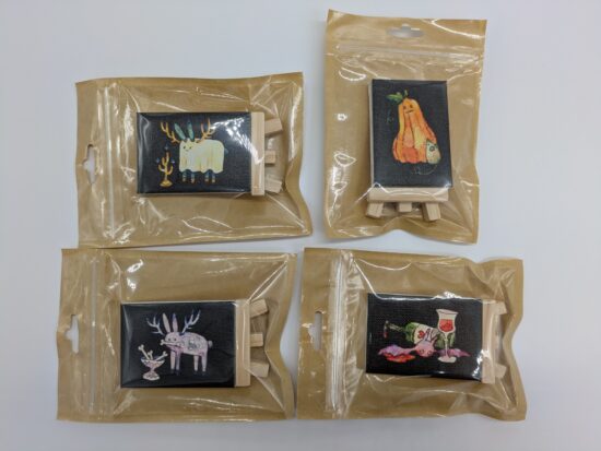 キャンバス生地の上から絵の具をおいた目にも鮮やかな原画や心を射止める繊細な筆遣いのイラストが描かれたポストカード、小さくてかわいい複製ミニキャンバスなどのグッズ販売も行っております。