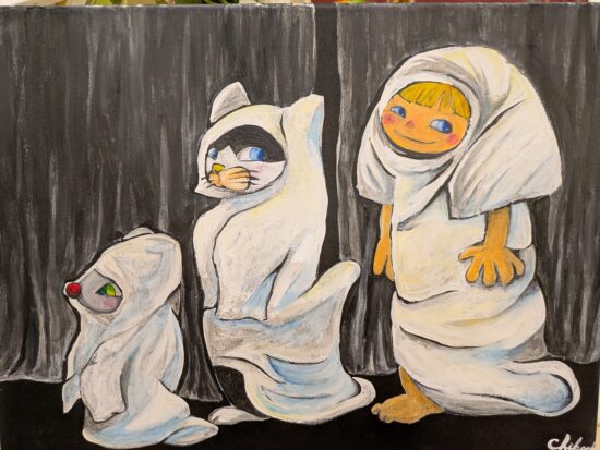 大胆な筆遣いのイラストから細やかな小道具がちりばめられた水彩画、素材の違った紙をカットして組み合わせた作品など様々な絵を展示いたします。
